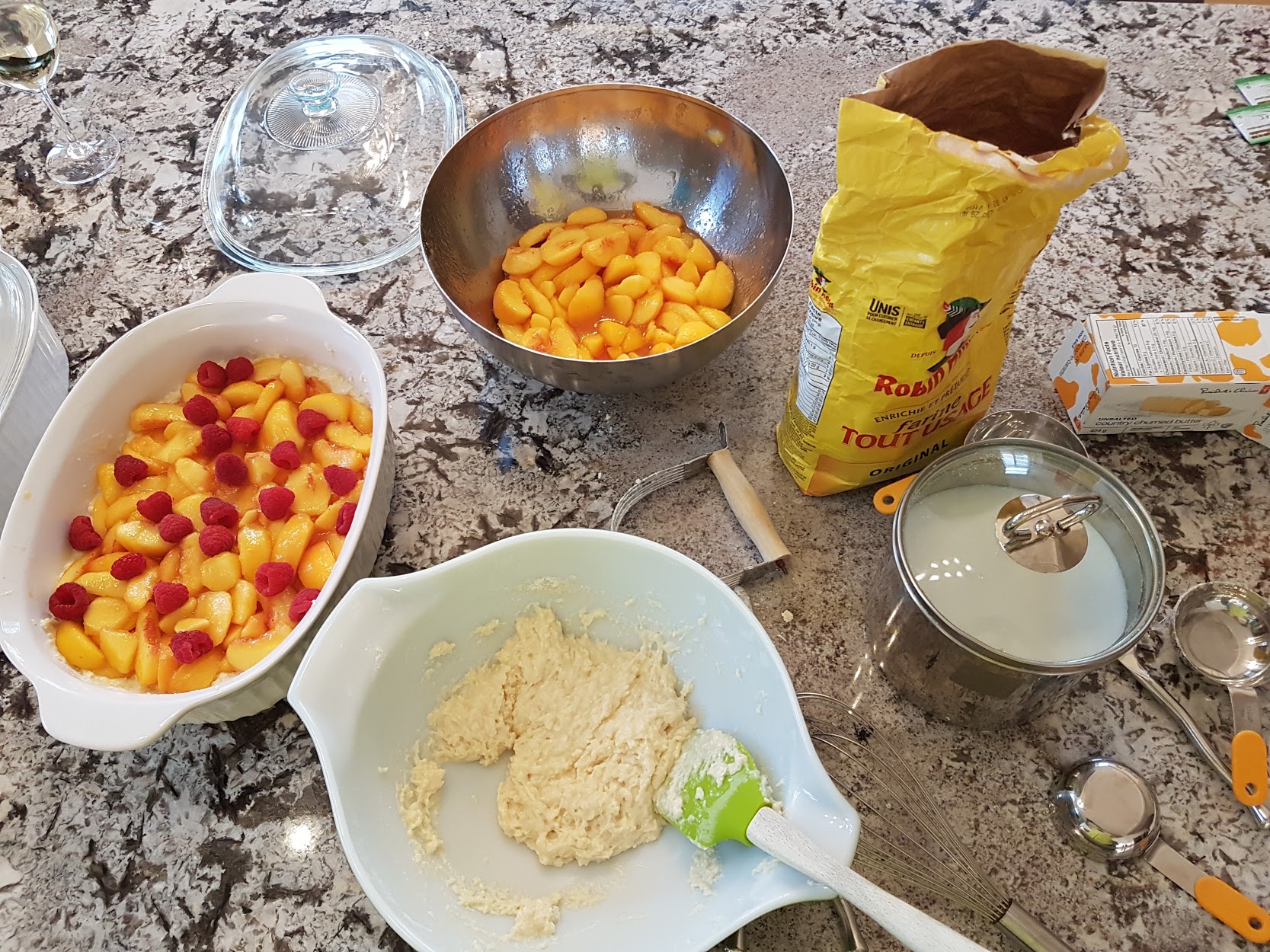Peel peaches, cut into small pieces, sprinkle with white sugar and set aside.  Combine flour and sugar in large bowl.  Cut in butter until mixture is crumbly (Use a pastry cutter or two knives). Set aside 3/4 cup of this mixture for topping.  To the remainder, add the baking soda and baking powder.  Combine the beaten egg and sour milk.  Add to the dry mixture.  Stir until well moistened. Spread 2/3 of this batter over the bottom and part way up the sides of a greased 9″ (23 cm) springform pan.  Spoon the peaches over the batter.  Drop spoonfuls of the remaining batter over the peaches.  Sprinkle with the reserved crumb mixture.  Bake @ 350 degrees for one hour.
