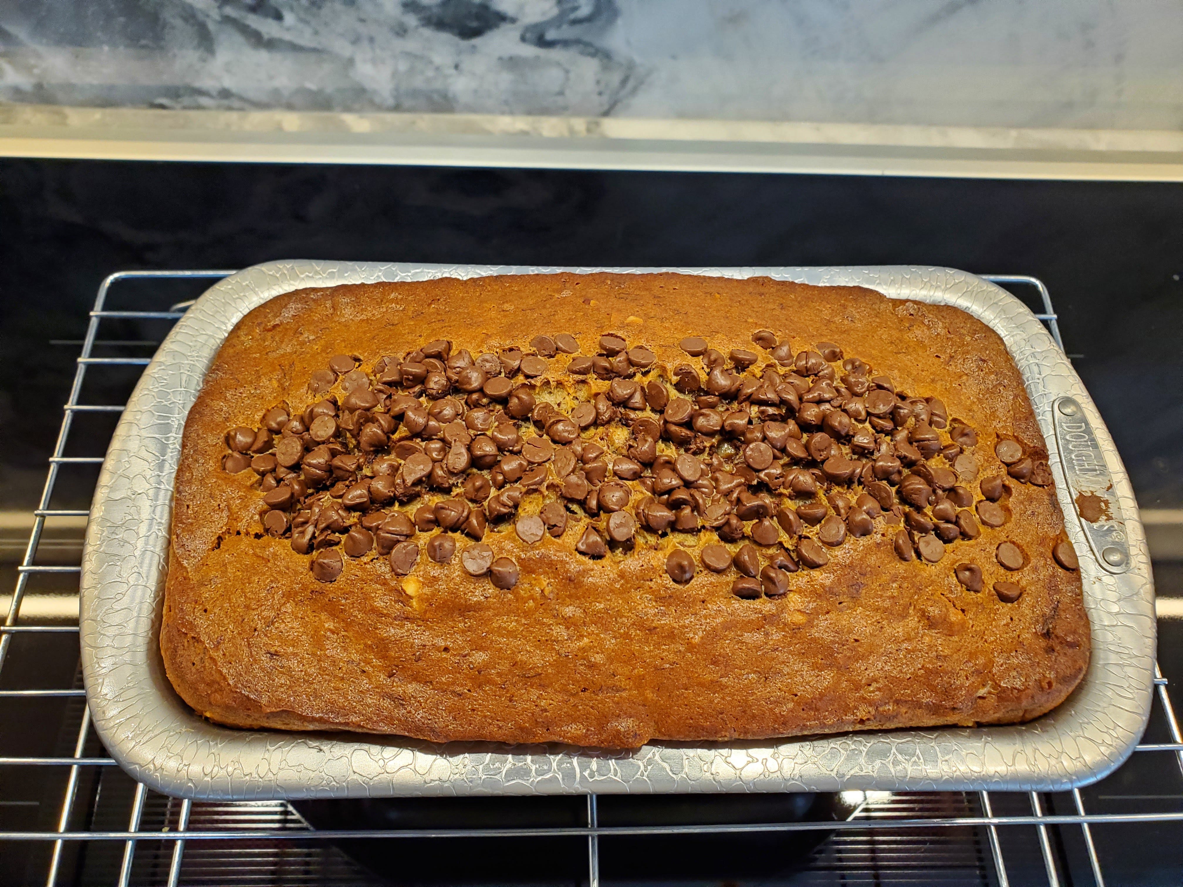 Before I put it in the oven I put chocolate chips on top of the loaf and sprinkle sugar on top as well.
